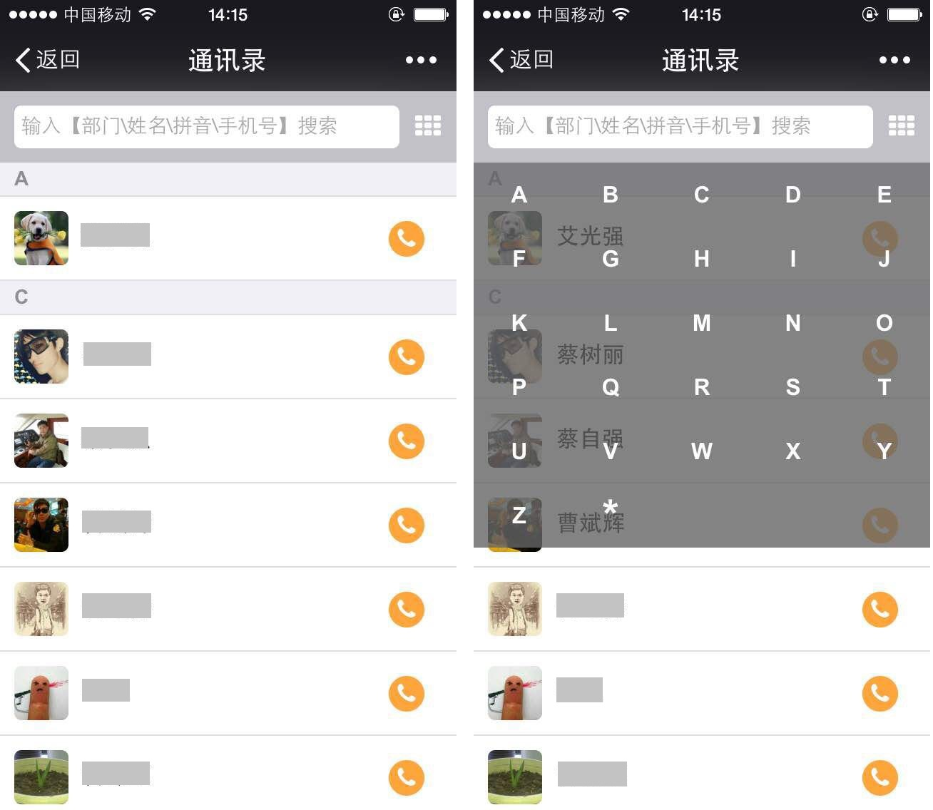 也可按姓氏首字母快速定位联系人:点击搜索框后方图标,显示26字母,选择目标联系人姓氏首字母后即查询出该姓氏的所有人员