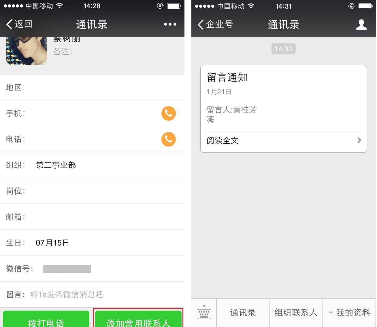 2、常用联系人:显示所有常用联系人,(注:在使用微信企业号过程中涉及到的负责人及相关人、@人员,系统将默认此批用户为常用联系人,在常用联系人列表中默认排在手动设置的常用联系人之后。)
