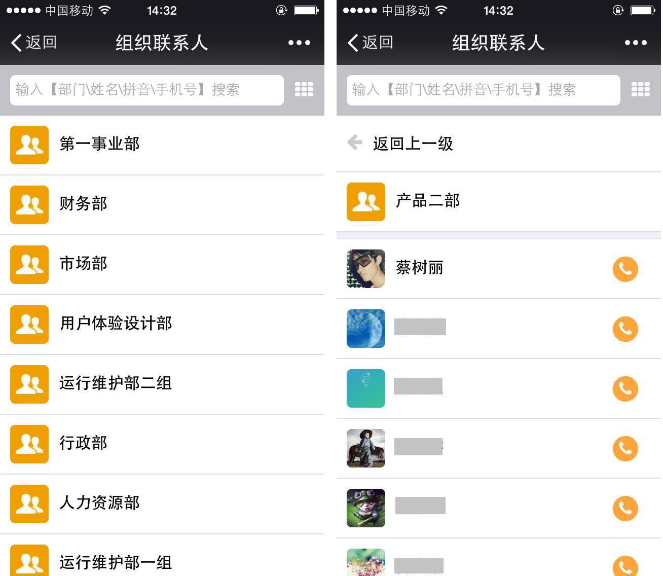 可按部门/姓名/拼音/手机号模糊搜索,输入后点击后方搜索图标即可查询到相关人;(注:输入部门,显示部门所有成员)