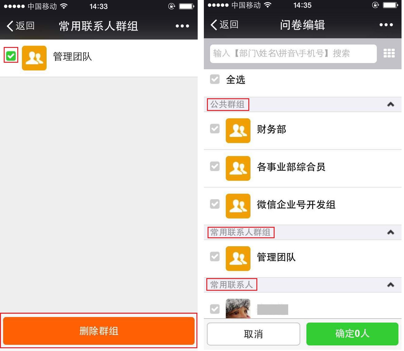b.会议助手、移动CRM、移动外勤、移动审批、任务申请、工作日志、超级表单、请假申请等应用,选择负责人/相关人时,可从公共群组、常用联系人群组、常用联系人、通讯录联系人中选择