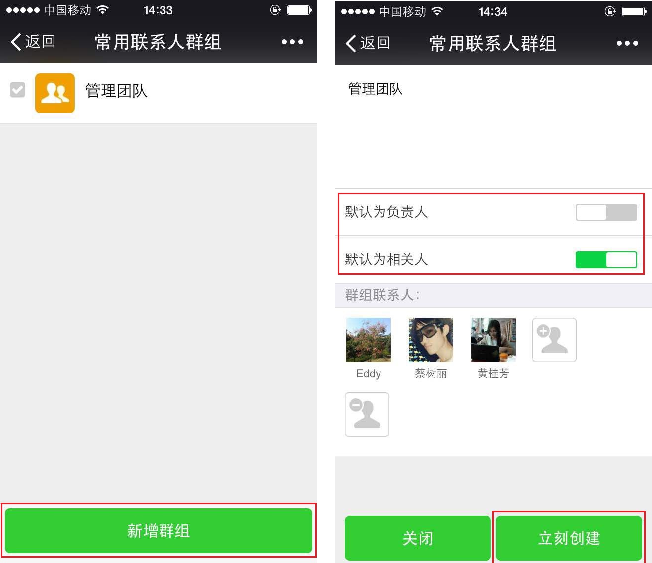 【我的资料】-【常用联系人群组】显示所有常用联系人群组,点击“新增群组”,输入名称、选择目标组员,点击“立即创建”即可。若勾选“默认为负责人“或”默认为相关人“,则在选择负责人/相关人时后将该组人自动选上