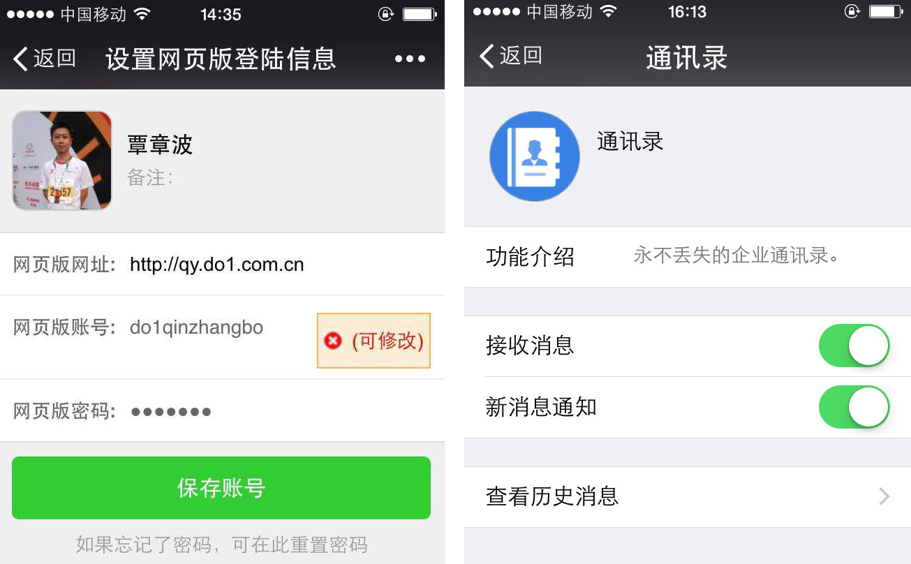 WEB账号是员工登陆网页版道一云http://qy.do1.com.cn的个人账号,员工能够在“WEB账号管理”中设置自己登陆网页版道一云的账号和密码。密码如不慎忘记,可直接在“网页版密码”处设置重置密码。微信企业号网页版采用和微信客户端相同的操作方式,易于使用,不需要重新熟悉网页版的使用方式。