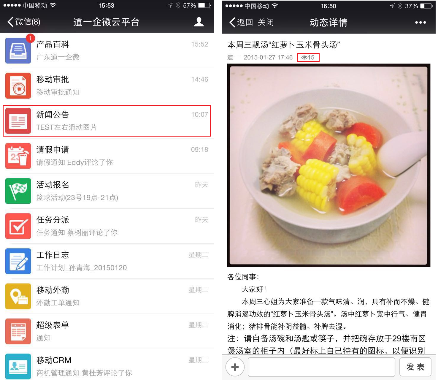 道一云提供【新闻公告】子应用,提供公司动态、通知公告(比如人力消息、财务通知等)、员工生日祝福、工资单一对一群发等信息的发布和展现。
