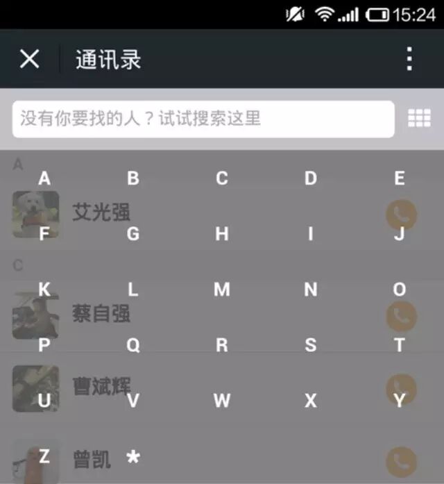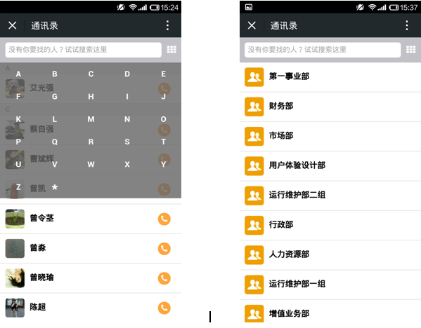 通讯录目前提供了两种方式定位联系人,关键词(姓名、手机、状态、拼音)搜索和部门定位。