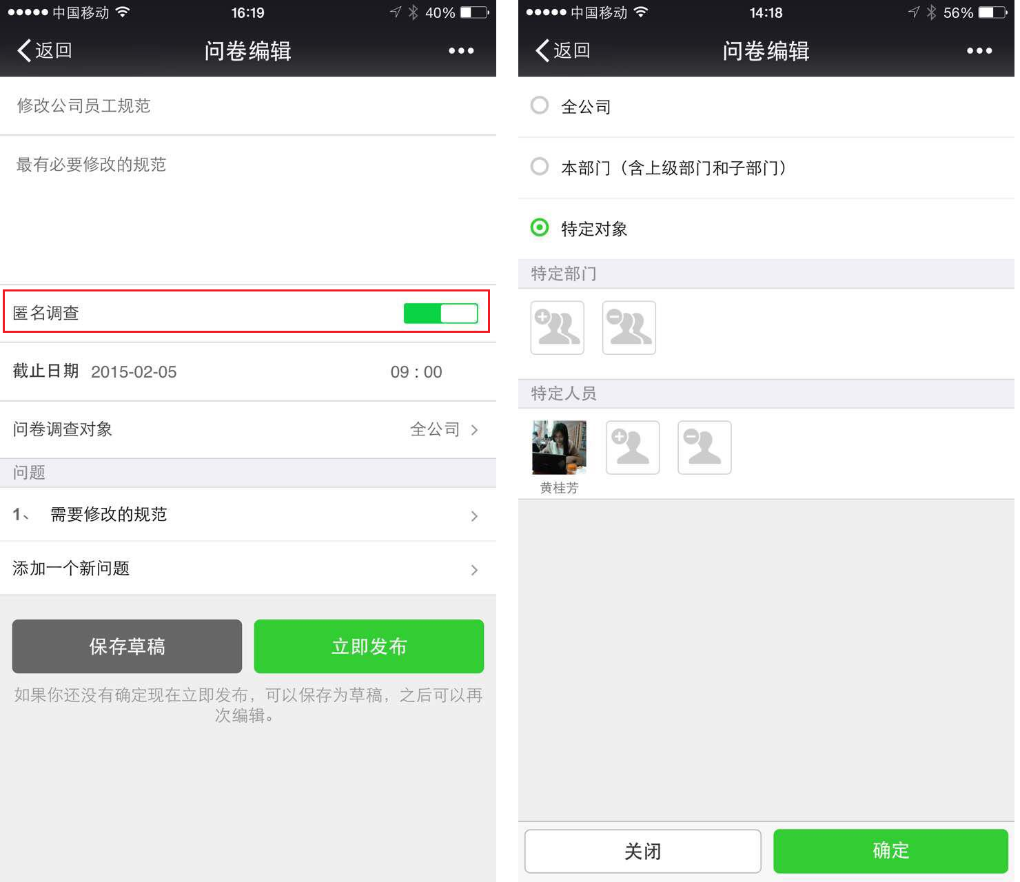选择“是否匿名”开关、选择目标对象;添加问题,选择类型