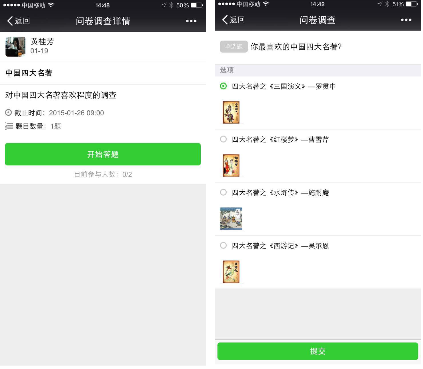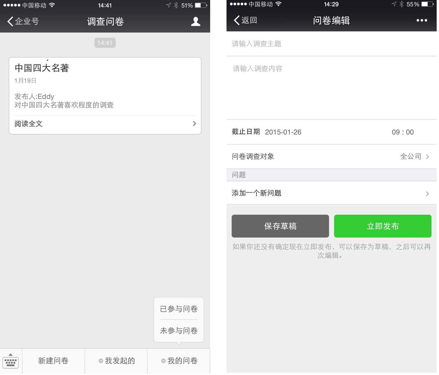问卷调查子应用可以把问卷送达到手机上,让员工在方便的时间里回应问卷。问卷发起自由配置,支持单选、多选、问答,微信通知目标人员作答,且问卷时间过后,无法再答题。