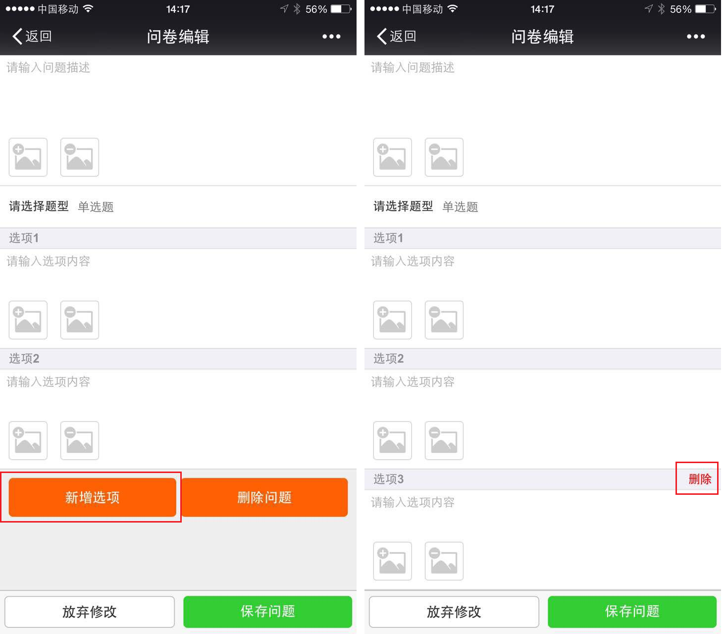 当用户放弃编辑问题时,可点击“删除问题”或者“放弃问题”回到问卷页面。