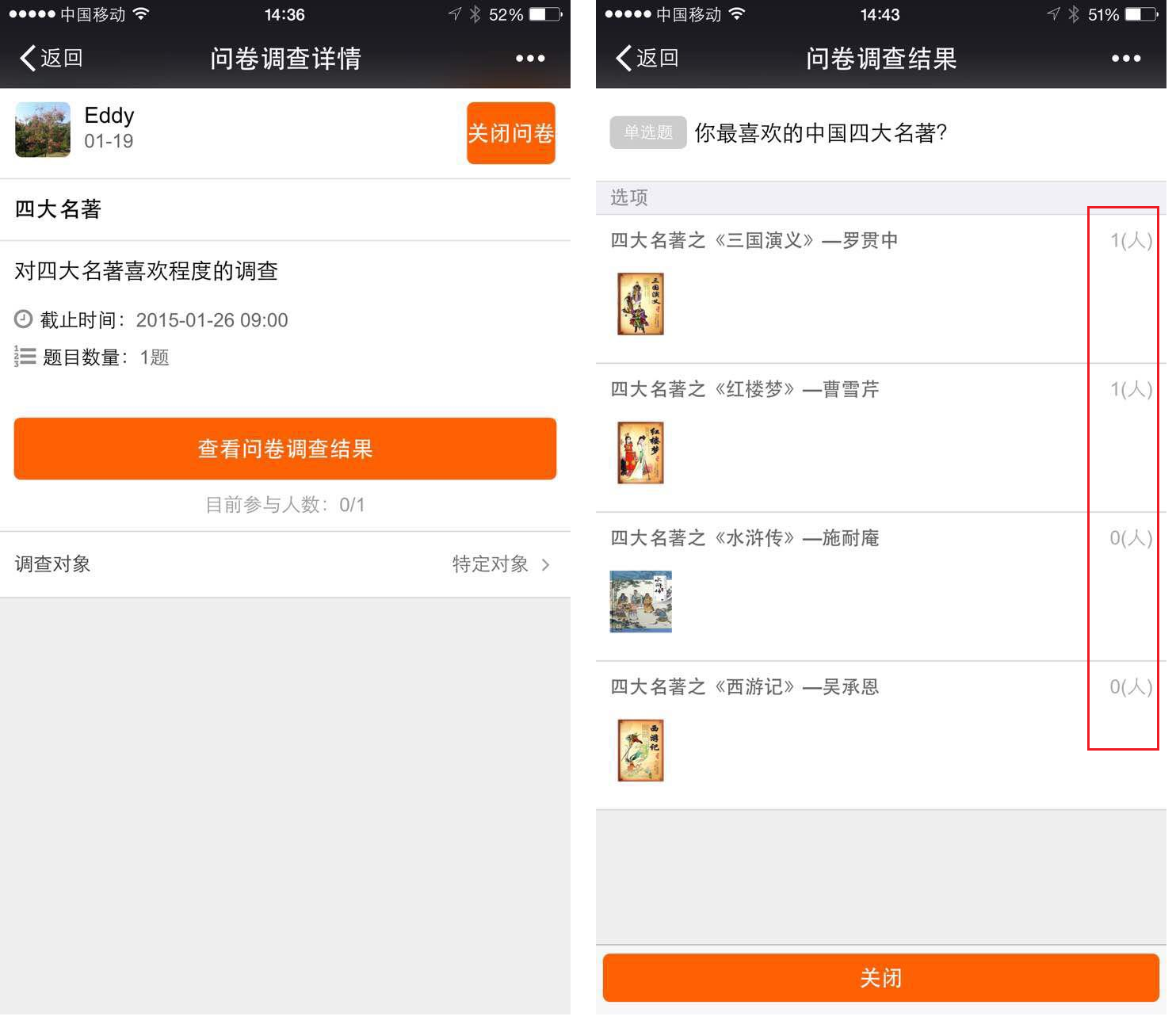 提交答案后,问卷发起者在【我发起的】问卷详情页面点击“查看问卷调查结果”,可以查看每个问题、每个选项的回答情况,也可关闭。