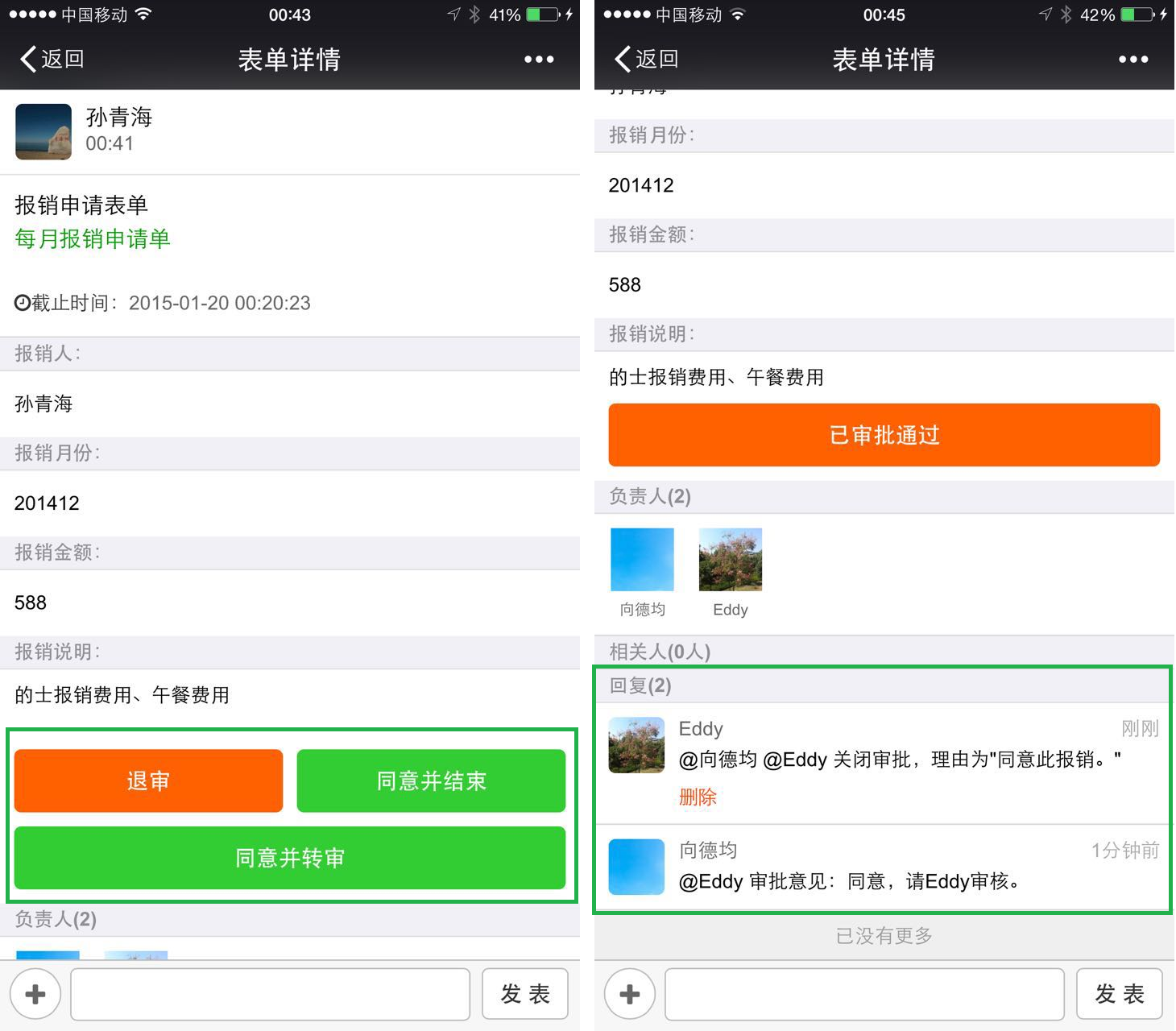 选择了负责人相关人选项的表单,负责人还可以在线回复审批,并通过@转交他人审批。
