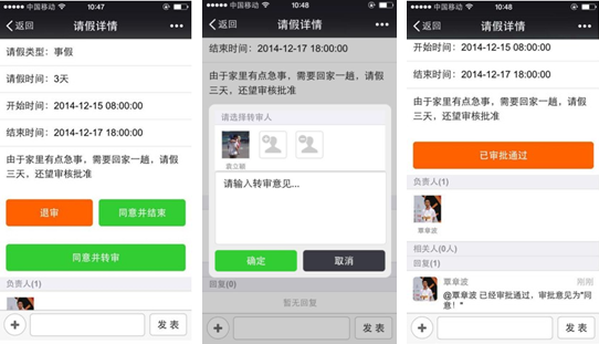 负责人接到请假申请消息,选择:退审、同意并结束、同意并转审(再转他人)。