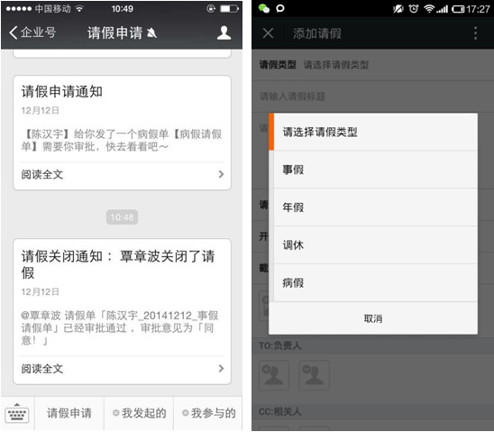 道一云请假申请应用,提供在线请假、审批与转审的功能。