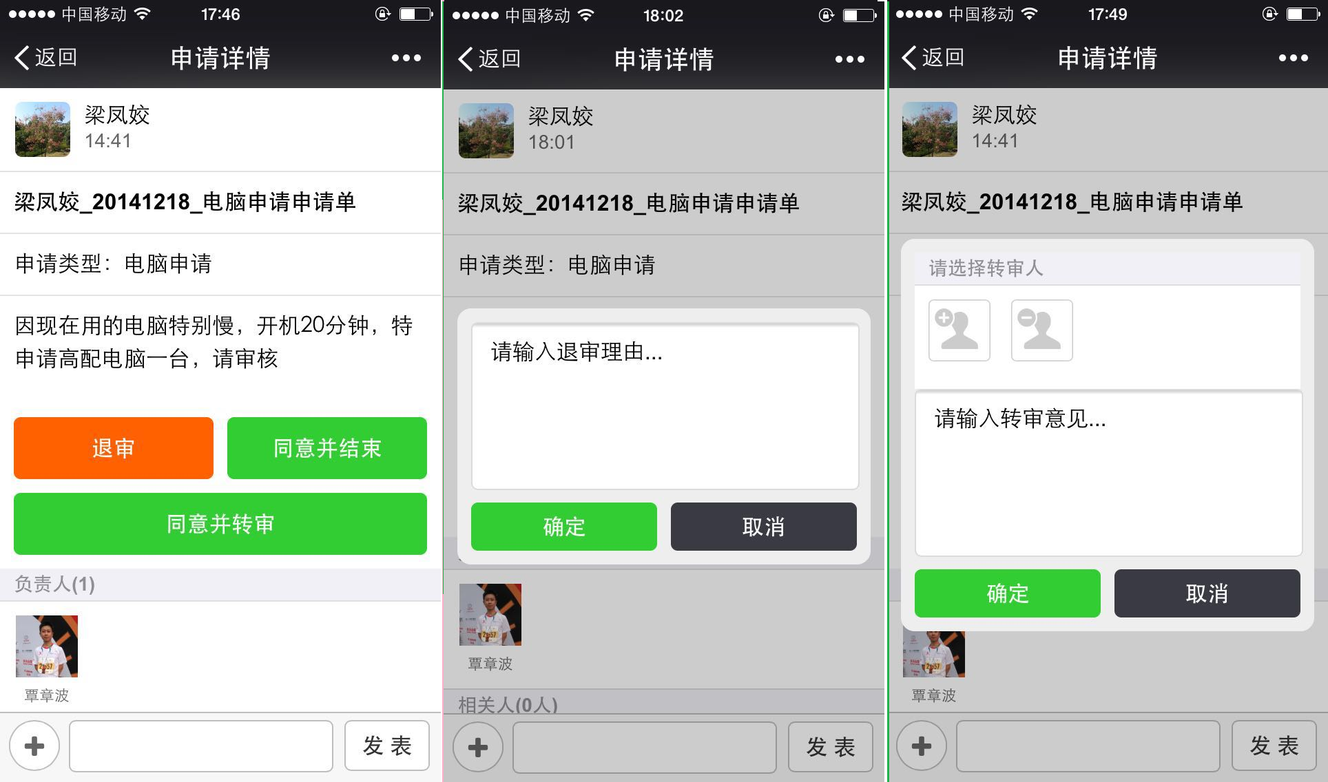 道一云提供【移动审批】子应用,可用于员工在手机中发起审批申请以及审核人在手机上审批申请单。发起人在微信上提交申请,选择负责人和相关人,负责人和相关人会收到微信通知对申请单进行审批,可以退审、转审、审批的操作实现申请审批单的流程操作。
