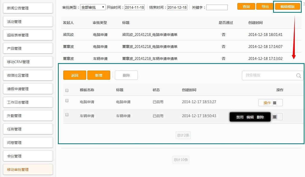 在道一云后台的"移动审批管理"中,后台管理人员需要点击“编辑模板”对“审批类型”进行增、删、改、查的操作。