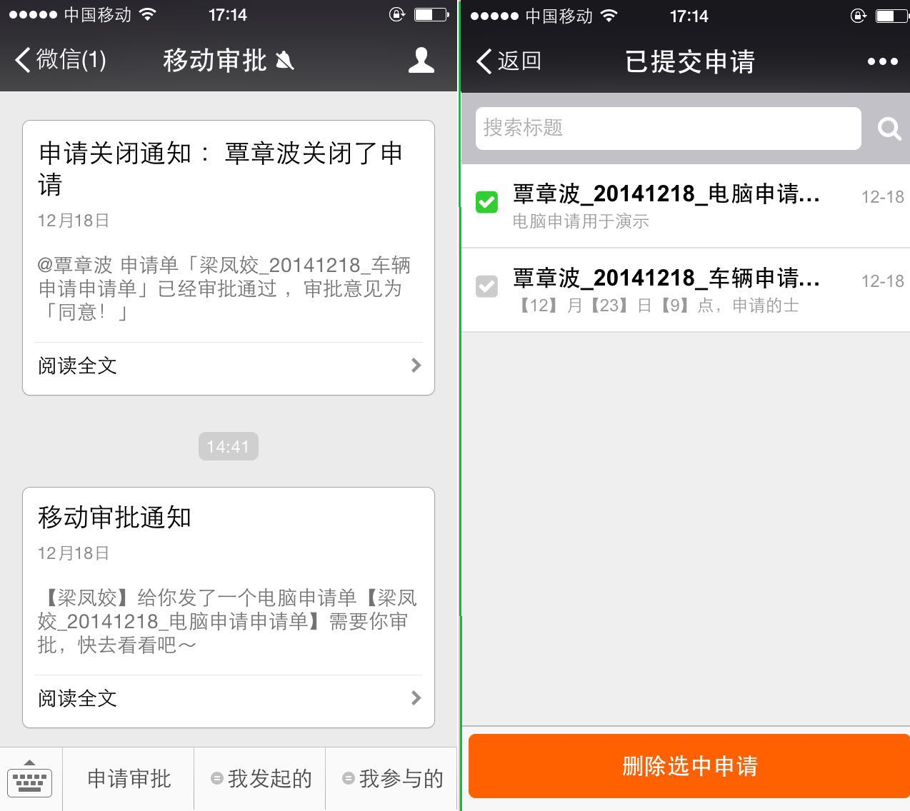 移动审批提供申请单查看的功能,按照菜单类别显示为:待提交申请、已提交申请、已关闭申请