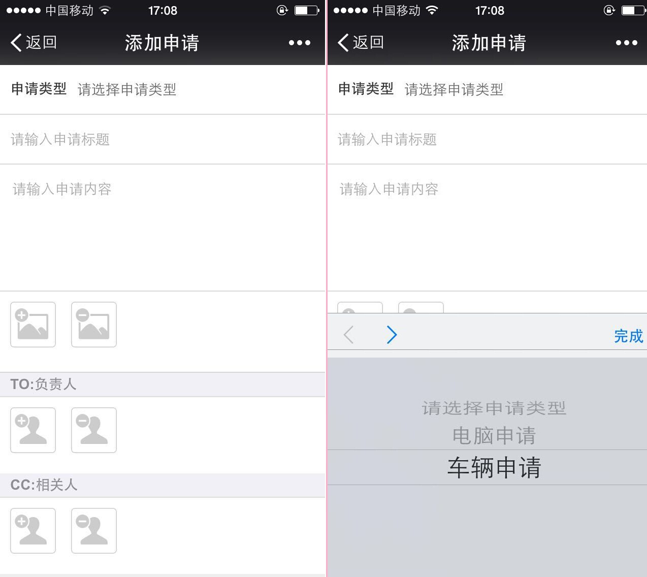 发起人点击底部菜单中的“申请审批”,可以新建审批申请: