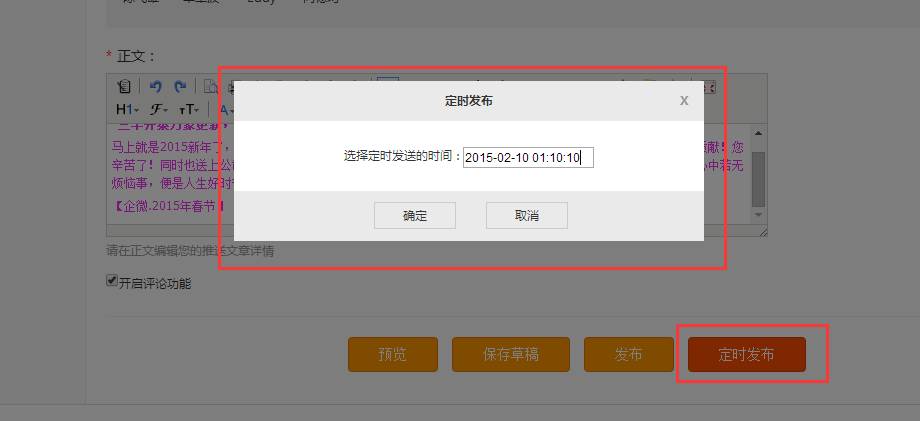 2、新增新闻时,输入内容后,点击最下方的按钮[定时发布];