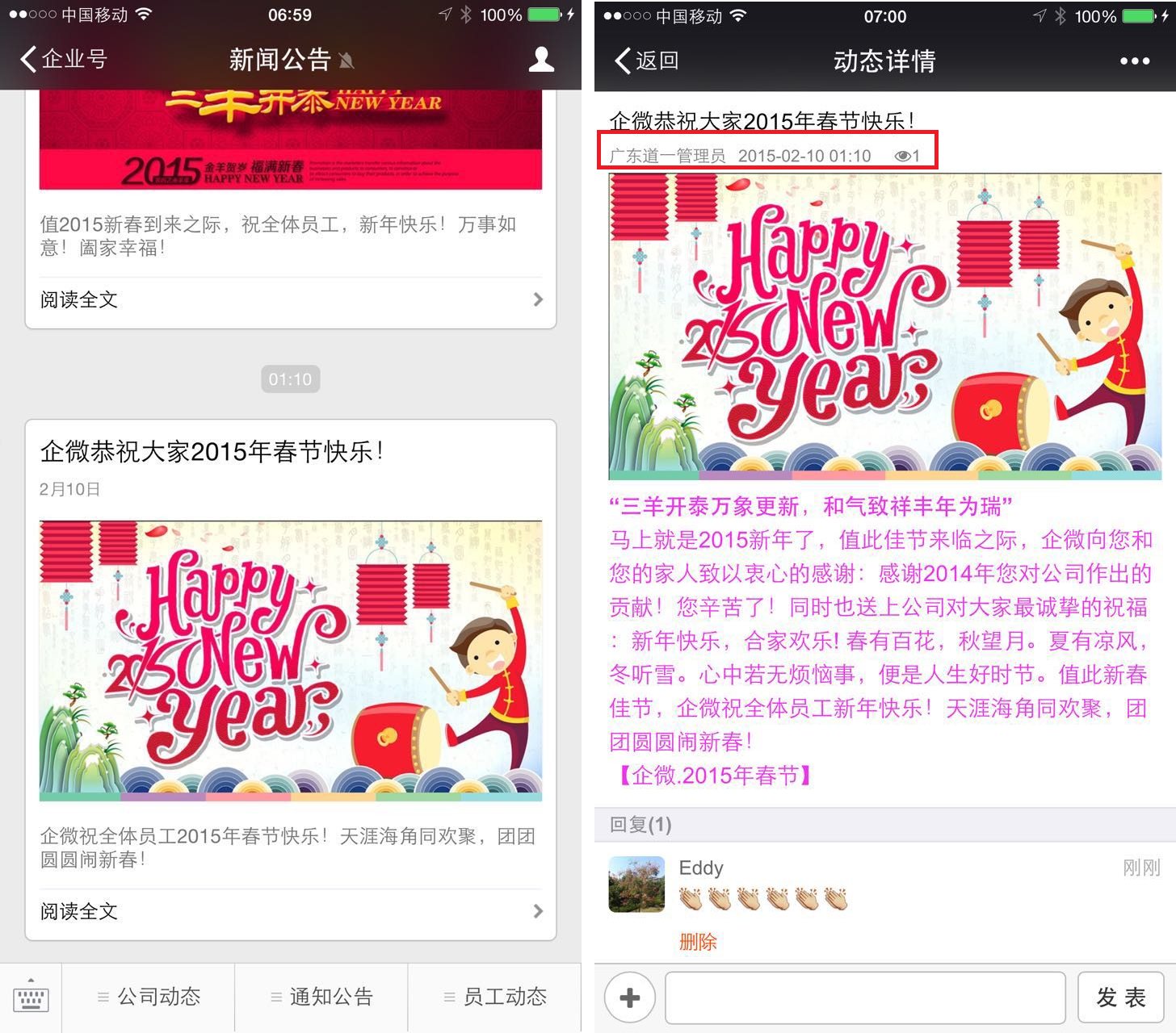 2.下载完成后,可通过新增新闻(见上文【新闻发布】操作指示),将新年祝福图片选为新闻封面,并填写新闻祝福正文。发布成功后微信端收到效果预览如下: