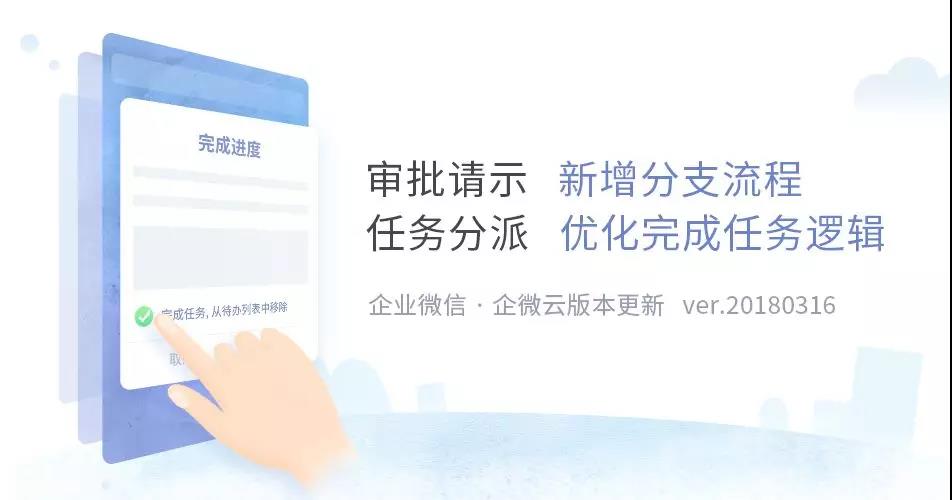 企微云平台更新导读 ① 任务分派优化完成任务逻辑。任务负责人按时长更新进度时,可勾选「完成任务」标记任务已完成,同时该任务不再显示在其待办列表中。解决此前任务发起人...