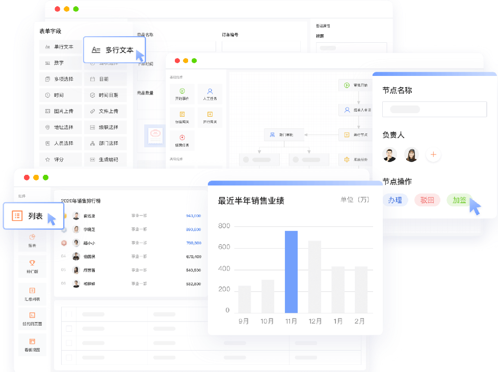 - 敏捷构建:无需深厚代码基础,通过可视化拖拽、配置化组件,快速搭建贴合南京银行具体需求的管理应用(如OKR跟踪平台、安全检查系统、工会审批流程等)。