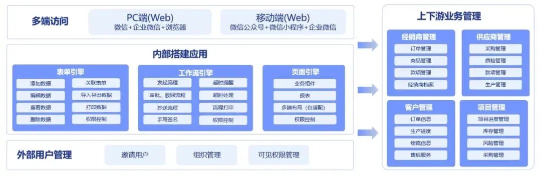 针对连锁企业“人员多、角色杂、流动快”的特性,七巧低代码平台的外部互联功能提供了轻量化解决方案。
